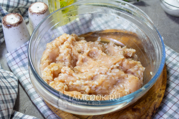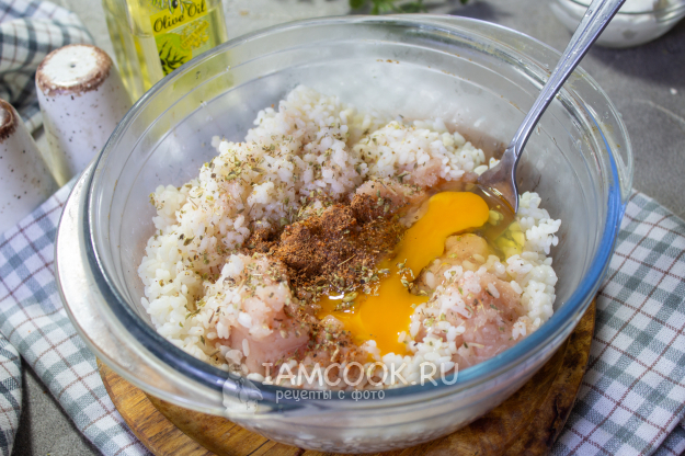 Отварной остывший рис смешайте с куриным фаршем, куриным яйцом и специями на ваш вкус.