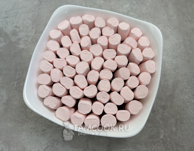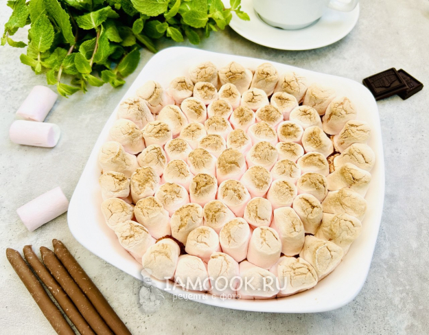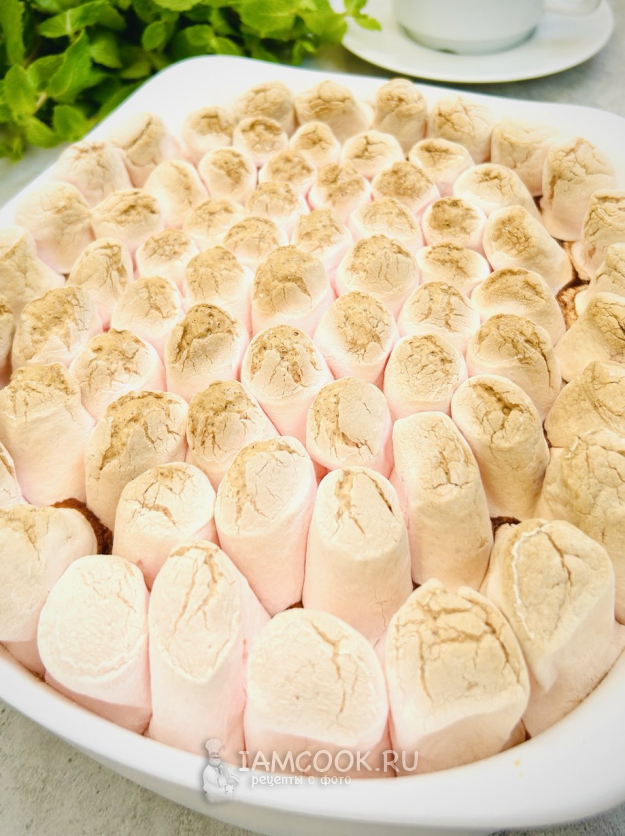 Сверху распределите как можно плотнее зефир маршмеллоу. Отправьте десерт с шоколадом и маршмеллоу в духовку на 5-6 минут при температуре 220 градусов.