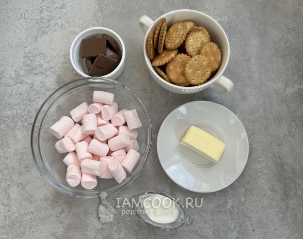 Перед приготовлением десерта с шоколадом и маршмеллоу в духовке соберите все необходимые ингредиенты по списку.