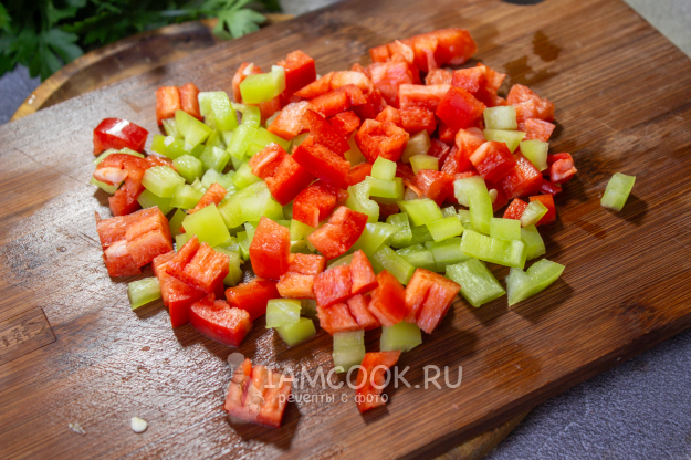Сладкий перец очистите от семян и нарежьте мелким кубиком. Отправьте в кипящую воду и варите несколько минут при небольшом нагреве.