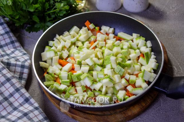 Кабачок нарежьте мелким кубиком, отправьте в сковороду к луку с морковью и готовьте вместе 3-4 минуты, чтобы он стал немного мягче.