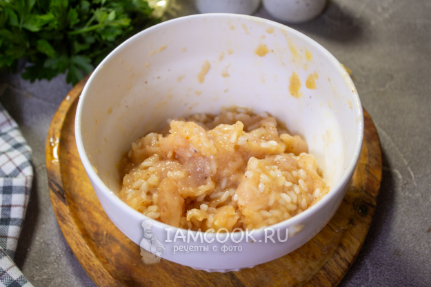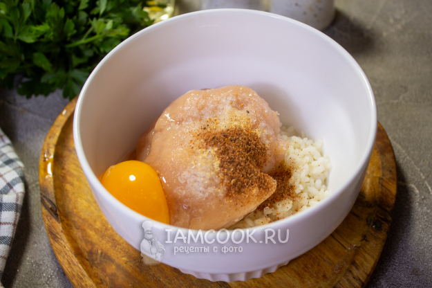 Куриный фарш соедините с отварным рисом, яйцом и специями на ваш вкус.