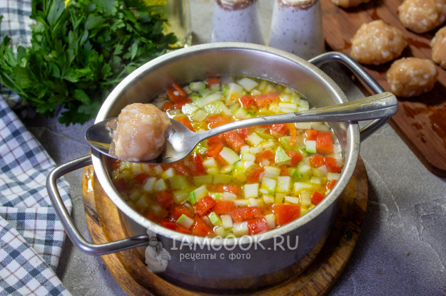 В кастрюлю с перцем отправьте пассерованные овощи со сковороды, доведите до кипения. Затем аккуратно добавьте сформированные тефтели. Варите суп 10-12 минут при небольшом нагреве.