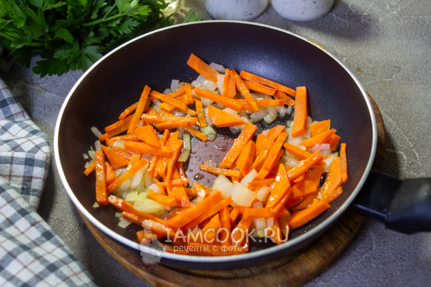 Лук и морковь очистите и нарежьте небольшими кусочками. Буквально несколько минут обжарьте их на растительном масле, до мягкости. Так бульон получится более насыщенным и красивым.