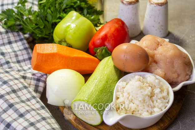 Соберите все необходимые продукты для приготовления супа с куриными тефтелями. Если у вас нет отварного риса, то для тефтелей вам понадобится 30 граммов сырого, который нужно промыть, залить водой соотношении 1:2 и сварить до готовности. Овощи в супе можно не обжаривать, а добавить в кипящую воду сырыми - так суп станет еще менее калорийным и полезным.