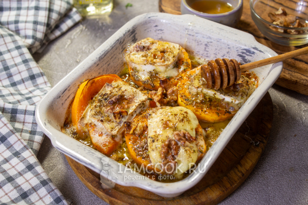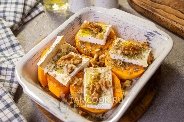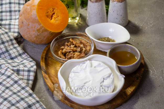 Соберите необходимые продукты для приготовления запекания тыквы с камамбером в духовке.
