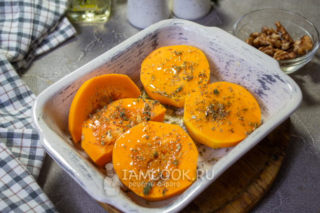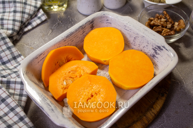 Тыкву помойте и обсушите. Нарежьте на кружочки толщиной примерно 2 сантиметра. Очистите от кожуры и положите в форму для запекания.