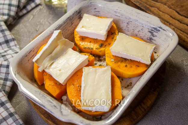 Достаньте тыкву из духовки, положите сверху кусочки нарезанного сыра.