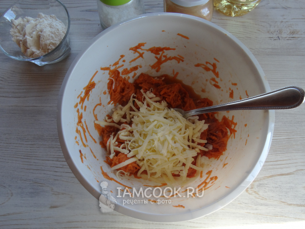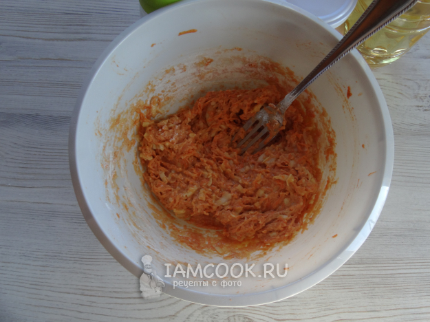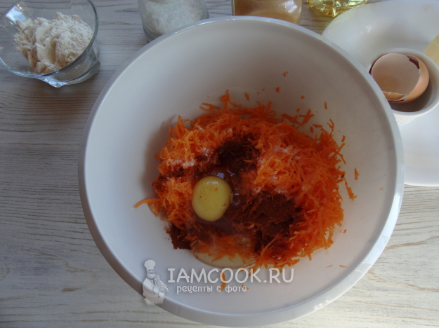 Морковь натереть на мелкой тёрке, отжать. Добавить яйцо, соль и паприку.