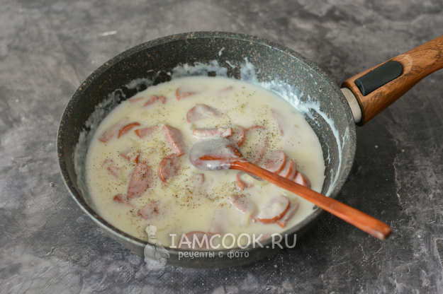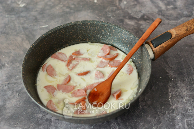 А пока варится паста, приготовьте колбасу в сливочном соусе.