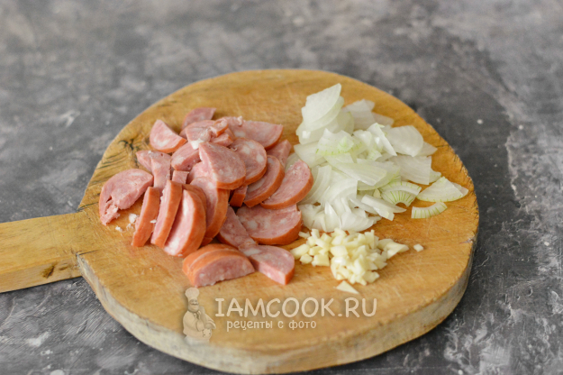 Для начала нарежьте мелко лук и чеснок. Колбасу нарежьте на свое усмотрение. У меня колбаса маленького диаметра, и я нарезала ее полуколёсиками.