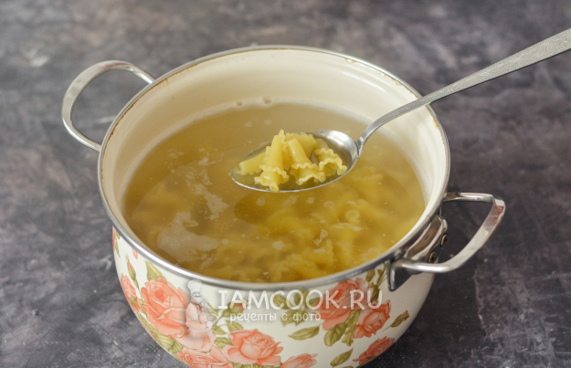 Для варки пасты, по традиции, вскипятите большое количество воды и добавьте соль. Всыпьте в кипящую воду пасту и варите согласно рекомендациям на упаковке. Я варила 8 минут.