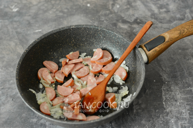Затем добавьте нарезанную колбасу и поджарьте ее вместе с луком 2-3 минуты.