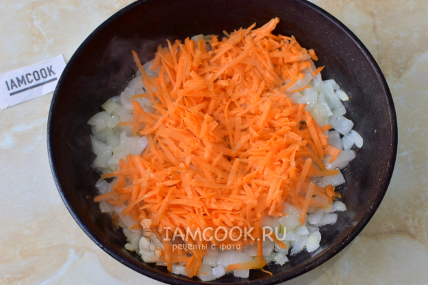 Морковь потрите на терке и добавьте в сковороду к луку. Перемешайте. Обжарьте все вместе еще 2-3 минуты.