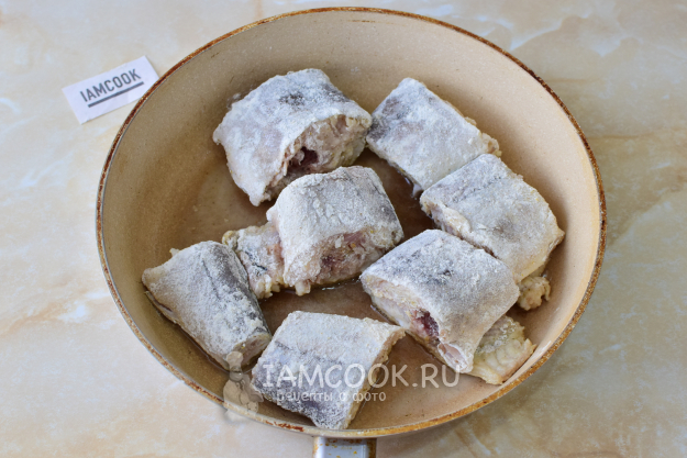 У пикши удалите плавники и нарежьте её на кусочки. Каждый кусочек обваляйте в муке и обжарьте с добавлением растительного масла.