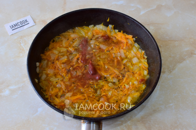 Затем добавьте в сковороду томатную пасту, уксус, сахар и горячую воду. По вкусу подсыпьте соль и специи. Накройте крышкой и потушите на небольшом огне 10 минут.
