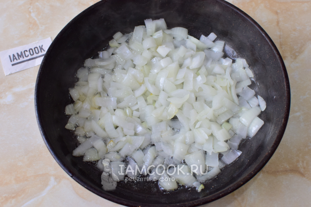На другой сковороде обжарьте нарезанный лук 3-4 минуты. Он прогреется и станет прозрачнее.