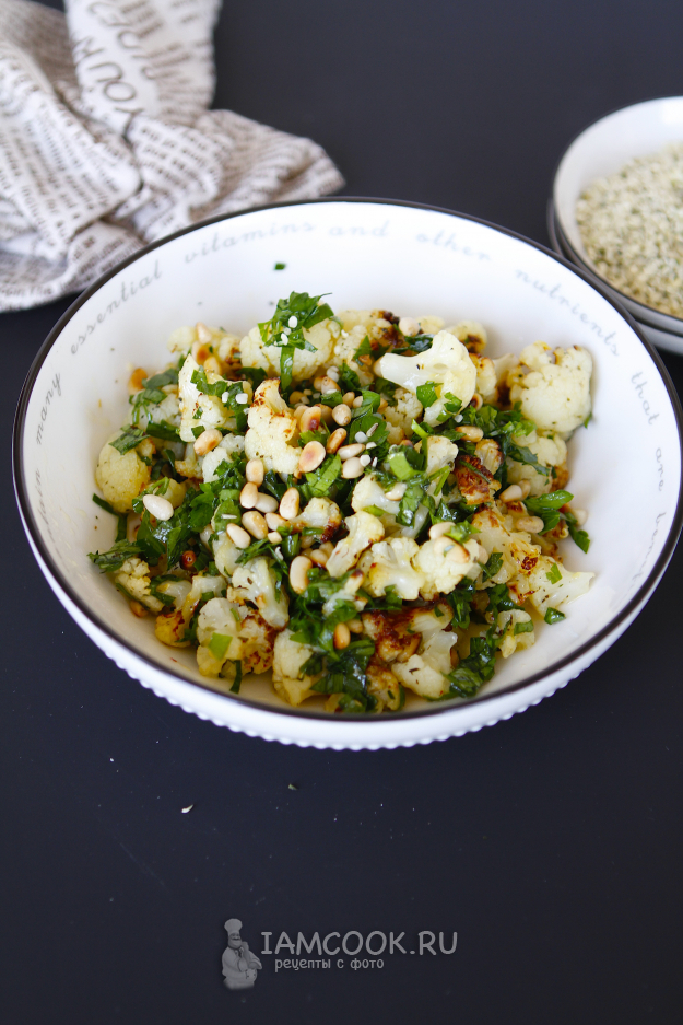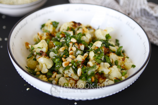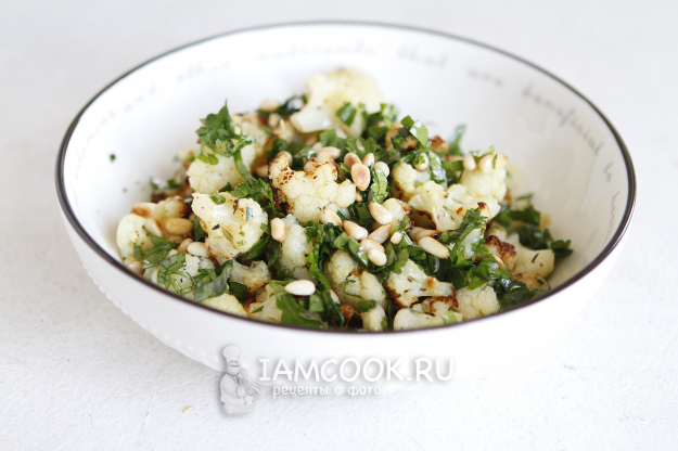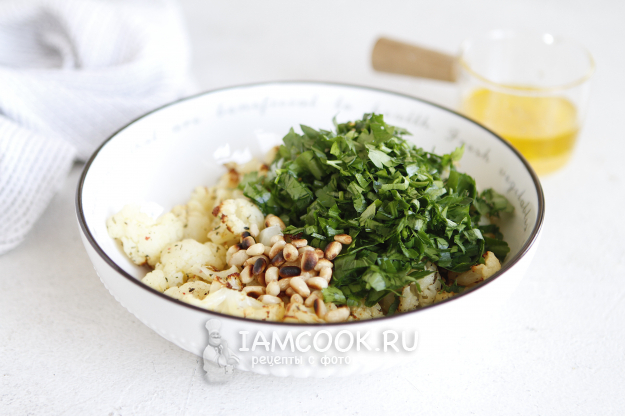 В чашу отправляем цветную капусту, добавляем зелень, слегка поджаренные кедровые орешки. Кедровые орешки можно заменить на фисташки или миндаль.