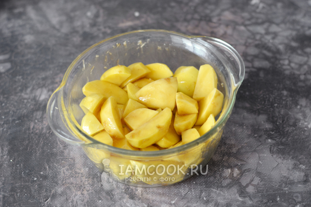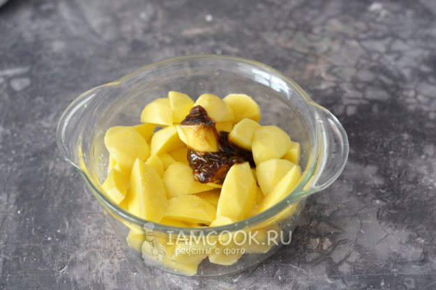 Перед запеканием очистите и нарежьте картофель дольками. Слегка приправьте его солью. Добавьте к картофелю оставшуюся 1/3 маринада из соуса терияки.