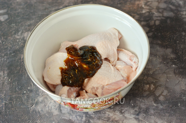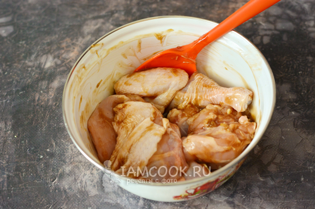 Тщательно перемешайте куски курицы с маринадом лопаточкой или руками и оставьте мариноваться при комнатной температуре на 1 час. Миску накройте крышкой.