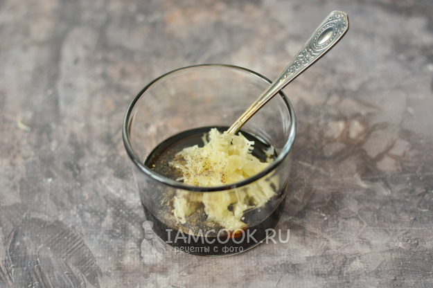 Для начала приготовьте маринад. Смешайте соус терияки с небольшим количеством чёрного перца, растительным маслом и измельчённым на мелкой тёрке чесноком.