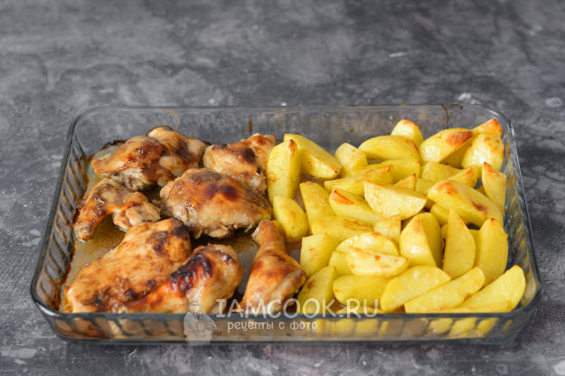 Духовки все разные и размер кусочков курицы - тоже. Поэтому ориентируйтесь на готовность по румяной корочке. А также признаком готовности курицы будет тест на отсутствие крови: то есть нужно кончиком ножа проткнуть самый толстый кусок, и если выделяется прозрачная жидкость без признаков крови, то курица готова. Ну а картошка, понятное дело, при прокалывании ножом должна стать мягкой.