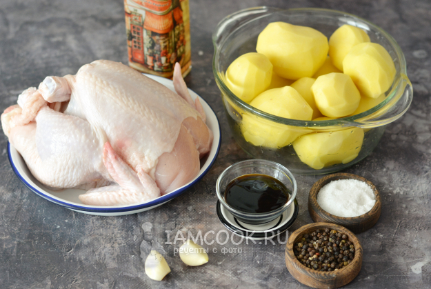 Перед вами набор продуктов, который вам понадобится для приготовления курицы с картошкой в соусе терияки в духовке.
