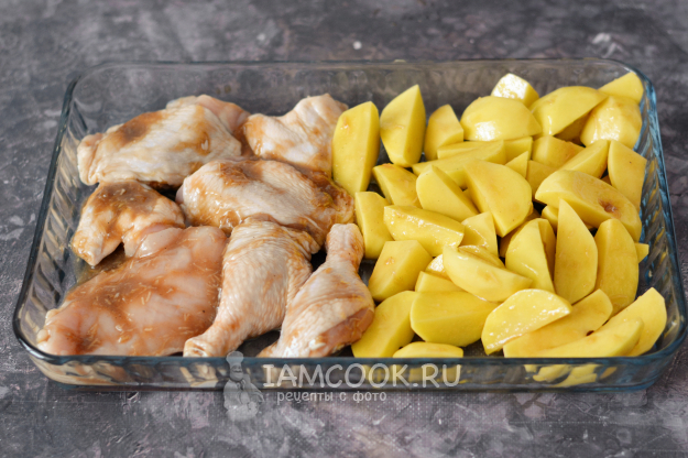 Возьмите вместительный противень. На одну часть противня выложите замаринованные куски курицы, а на другую - картофель.
