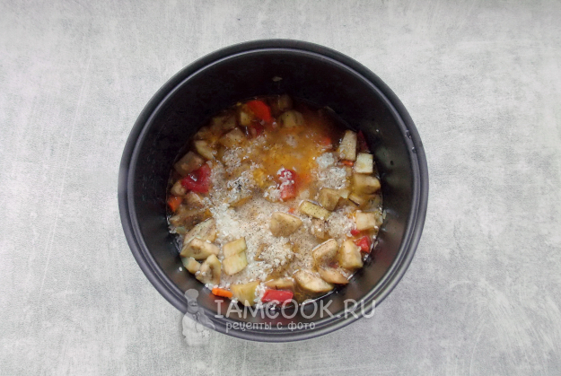 Рис промойте и выложите в чашу мультиварки с овощами. Посолите и поперчите.