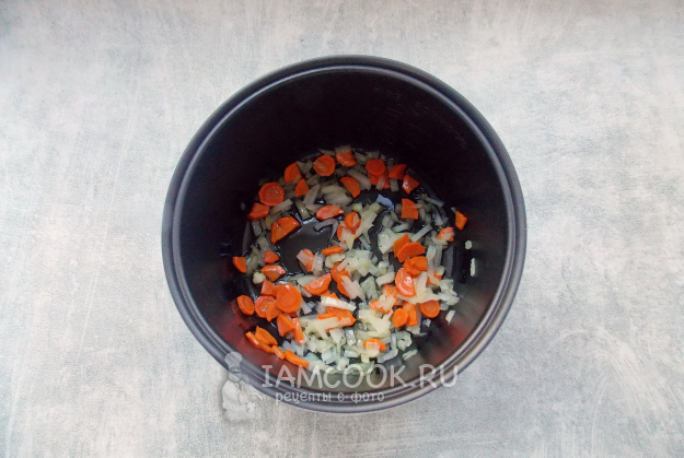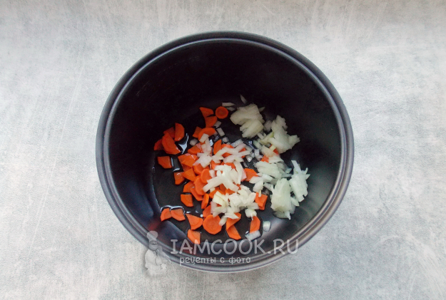 Морковь и лук очистите, помойте и нарежьте. Выложите в чашу мультиварки. Налейте растительное масло.