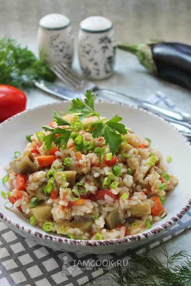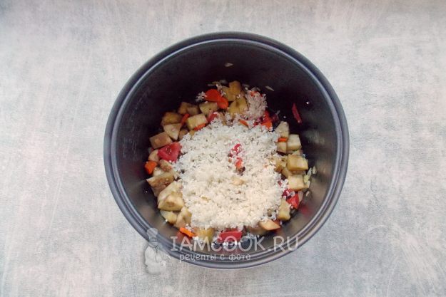 Соберите ингредиенты для приготовления риса с баклажанами в мультиварке.