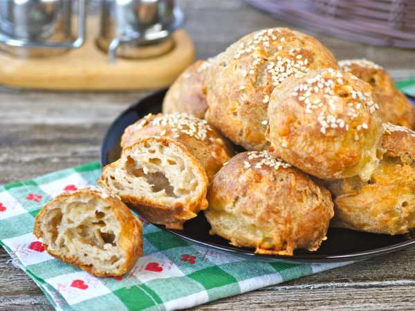 Отделяйте от теста небольшие части (весом 70 г) и подкатайте каждую такую часть в шарик-заготовку. Все заготовки будущих булочек выложите на противень, застеленный пергаментом для выпекания, каждую булочку можно смазать или взболтанным яичным желтком, или растительным маслом (как вам удобнее), присыпьте поверхность каждой булочки кунжутом. Булочки отправьте выпекаться в уже разогретую до 180 градусов духовку на 20 минут.