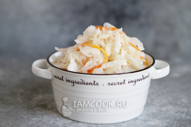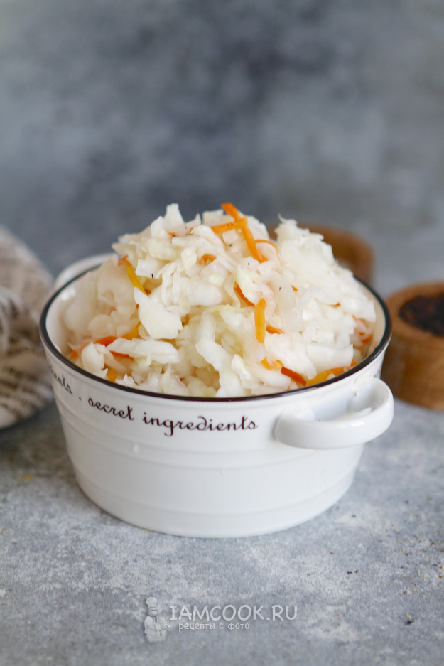 Так как возможности хранить квашеную капусту в погребе или на балконе у меня нет, я готовлю такие заготовки в небольшом объеме. Готовлю я ее в кастрюле, а по мере готовности перекладываю в контейнер вместе с соком и убираю в холодильник.