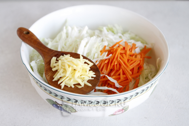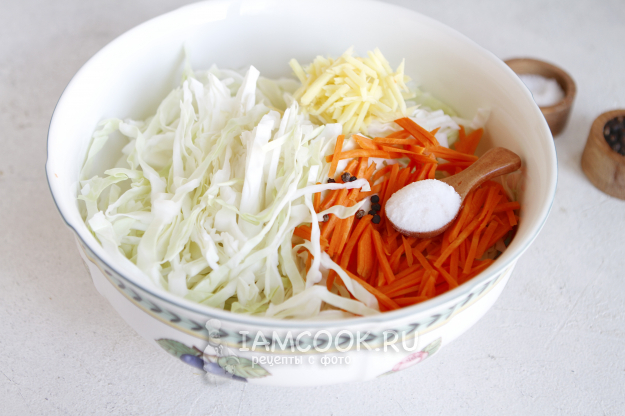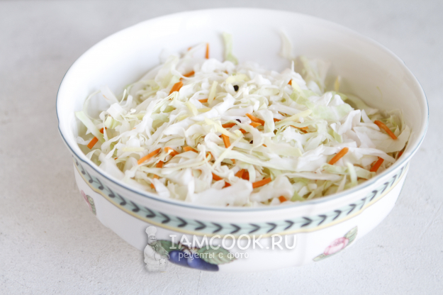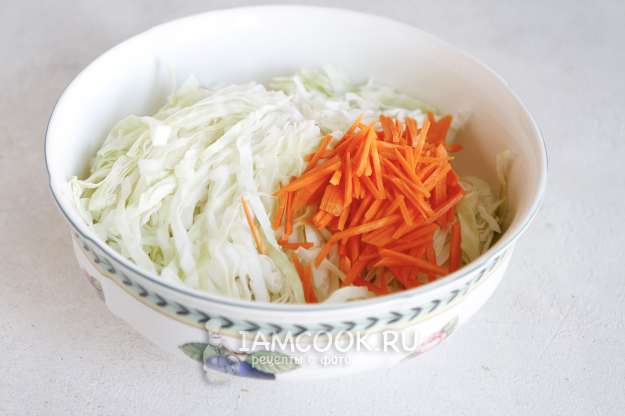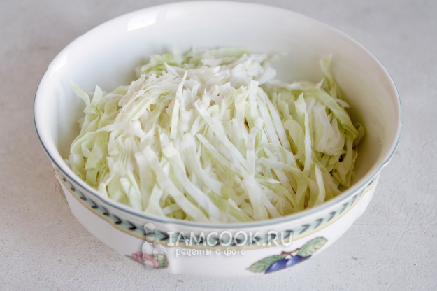 Снимите верхние листочки с кочана капусты. Разрежьте его на 4 части, удалите кочерыжку. При помощи специальной терки или вручную нашинкуйте капусту. Переложите капусту в глубокую миску.