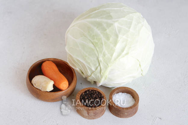 Соберите по списку все продукты для приготовления квашеной капусты с имбирем. Для закваски лучше всего выбирать поздние сорта капусты весом 1,5-2 кг. Листочки у такой капусты очень светлые, кочерыжка должна быть ровной, тоже светлой и без пятен. В такой капусте больше сахаров, а именно они придают вкус квашеному продукту.