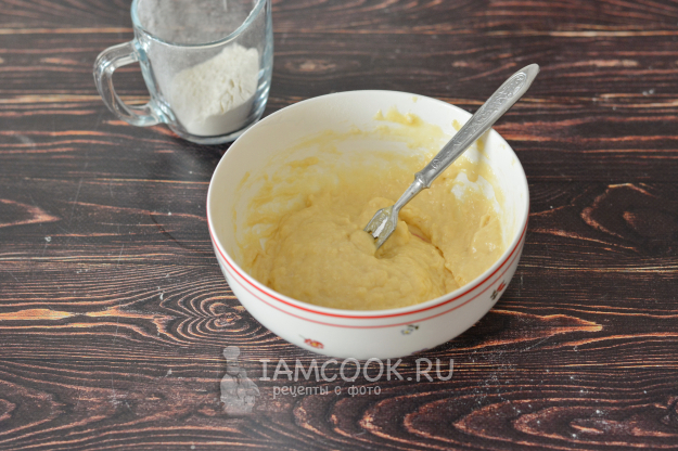Венчиком или вилкой тщательно размешайте тесто. Оно должно быть как густая сметана.