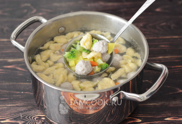 Прибавьте огонь и дайте супу закипеть. Проварите его ещё 5 минут и снимайте с огня. Суп с фрикадельками и клецками готов.