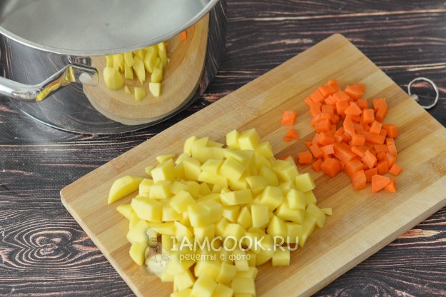 Очистите и нарежьте кубиками картофель и морковь. В кастрюле вскипятите воду, добавьте по вкусу соль и опустите в кипящую воду овощи. На среднем огне варите их около 10 минут.