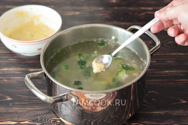 Как только суп с брокколи закипит, опускайте в него небольшими порциями тесто для клецек (примерно по половине чайной ложки).
