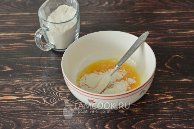 Теперь замесите тесто на клецки. Тут тоже нет ничего сложного. В миске взбейте яйцо со щепоткой соли и добавьте немного муки (3-4 столовых ложки).