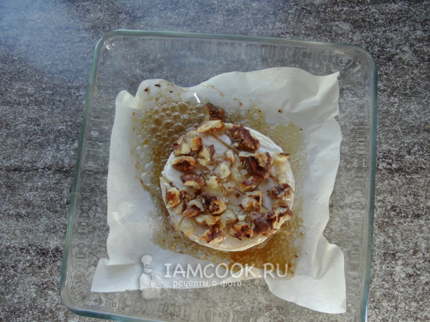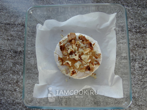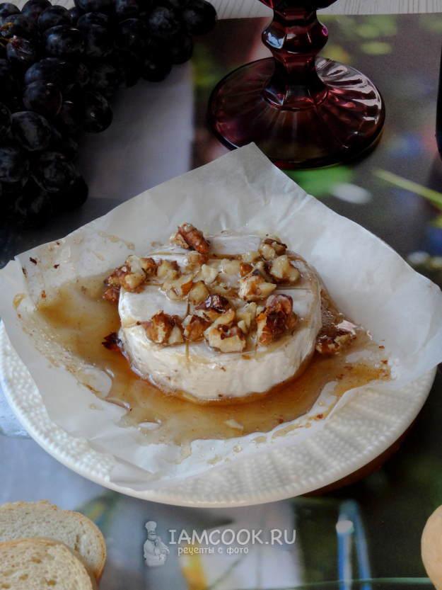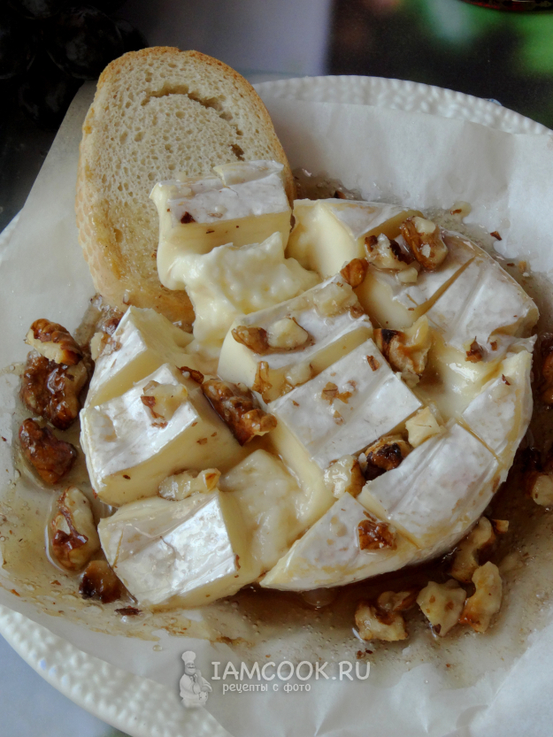 Сыр Камамбер прекрасно сочетается не только с оливковым маслом и чесноком, но и с мёдом. А если добавить немного орехов, то будет ещё вкуснее. Запечённый сыр — это прекрасная закуска, которую оценят как дамы, так и мужчины. Можно подавать с подсушенным багетом, крекерами или просто.