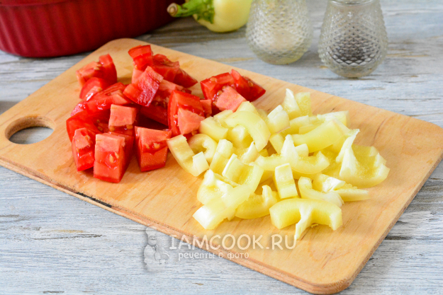 Также нарежьте кубиками помидоры и почищенные болгарские перцы.