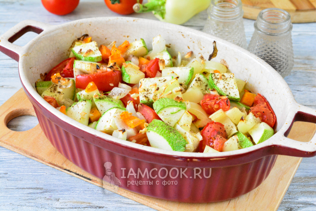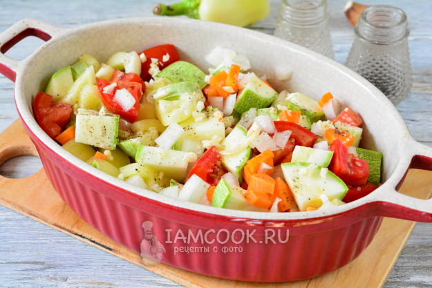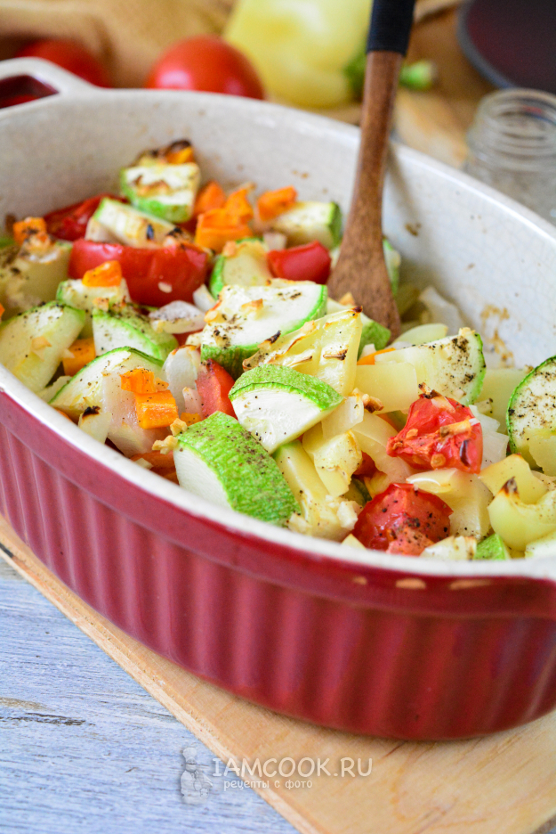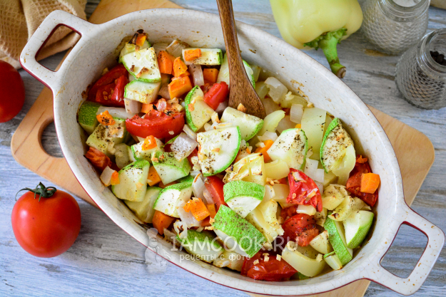 Запекайте овощное соте из кабачков в духовке при 180°С 35-40 минут, до готовности овощей. Если хотите, чтобы соте получилось более сочным, прикройте форму фольгой и в таком виде запекайте овощи до готовности.