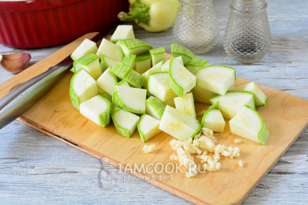 Кабачки нарежьте средними или чуть крупнее кусочками (кубиками). Мелко нарежьте чеснок.
