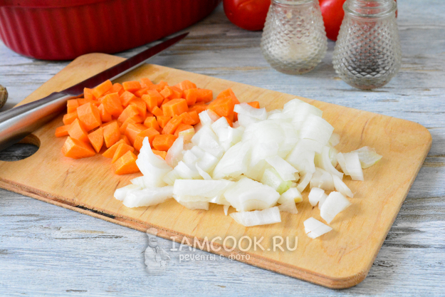 Почистите лук и морковь, овощи сполосните, нарежьте их кубиками для соте.