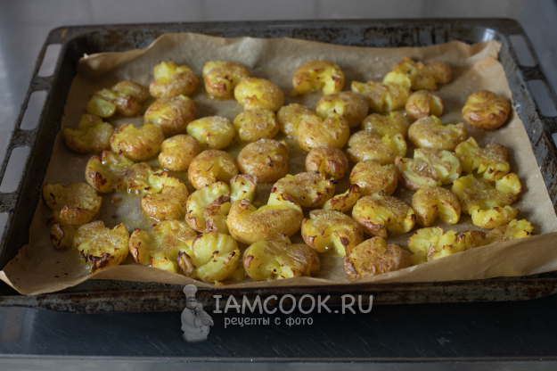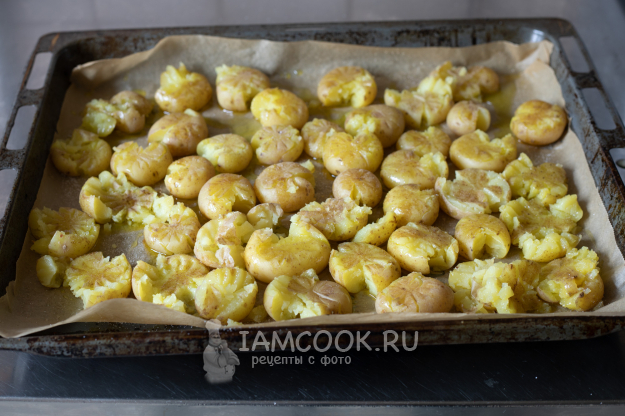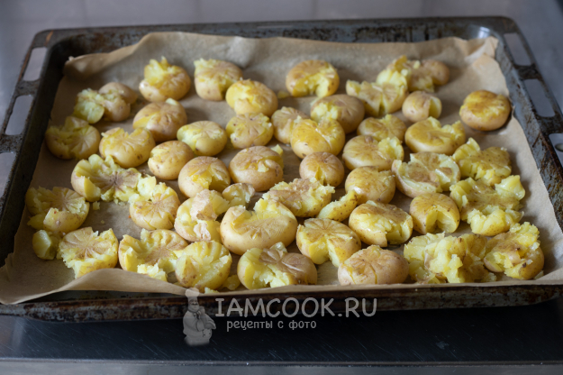 Высыпем картошку на металлический противень, покрытый кондитерской бумагой, и раздавим каждую картошину пестиком.