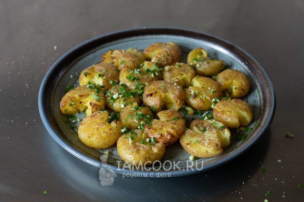 Готовую раздавленную картошку сервируем горячей, прямо из духовки. Сразу посыпать зеленью, припорошить свежемолотым перцем - и на стол. Простое вегетарианское блюдо.