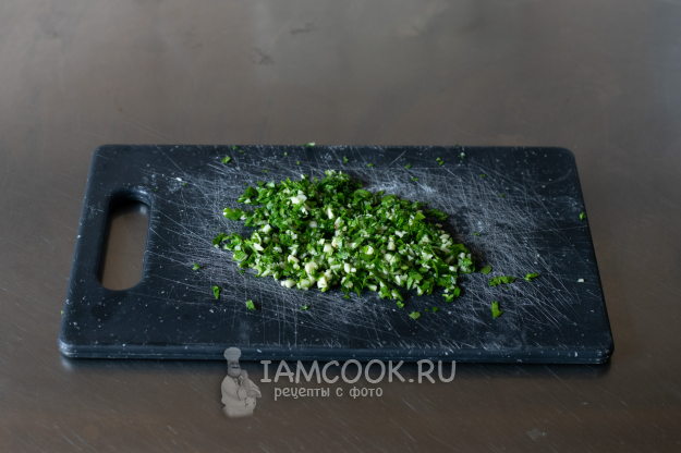Пока раздавленная картошка запекается в духовке, порежем травы. С моей точки зрения, петрушка с чесноком лучше подходит для горячего блюда, а петрушка с луком - для заправки картофельного салата, но базовая нарезка в обоих случаях одинаковая - всё в труху.