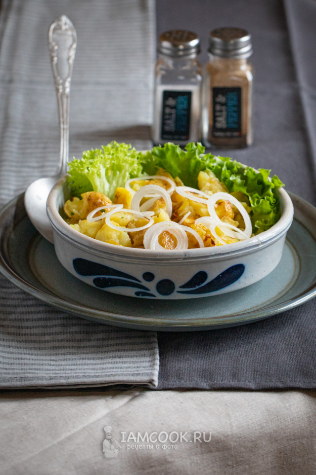 Если хотите салат, то там нужно на горячую полить уксуса (а можно ещё пару ложек горячего бульона), посыпать рубленых трав-приправ, промешать и дать настояться хотя бы 5-10 минут. Сервировать или чуть тепленьким, или вообще холодным, можно с тоненькими колечками лука - думаю, мужчины оценят.