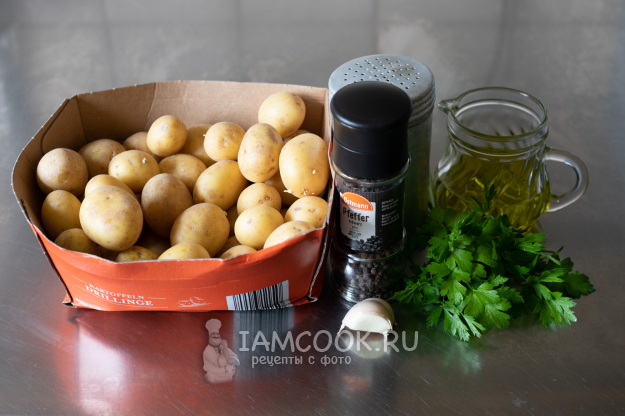 Соберём по списку ингредиенты для приготовления раздавленной картошки в духовке. Если картошка грязная, её следует хорошо помыть. Растительное масло сюда подходит подсолнечное с сильным запахом либо вообще оливковое (тоже запашистое).
